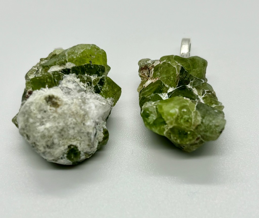 We have some amazing raw pieces of peridot available for purchase. They have been carefully crafted into necklaces. If you are interested in this item or any of our pieces, please send us an email to crystal@theharmonyshoppe.com. (P.S. this is one of my favorite stones)